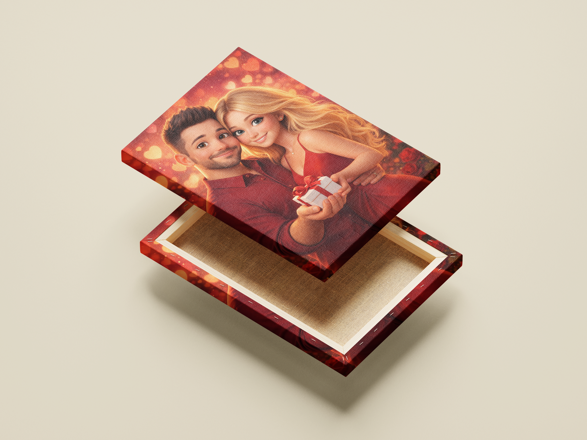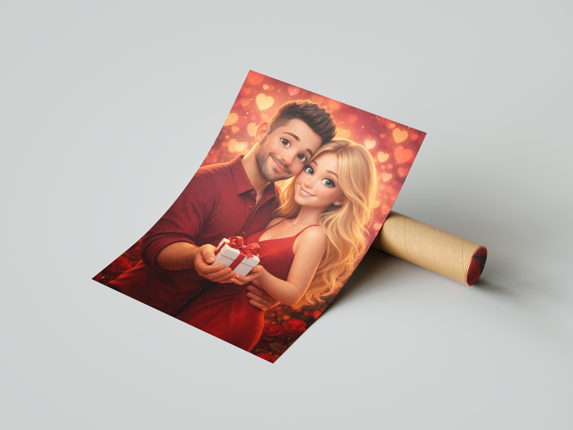 Zachowujemy Wasze rysy, fryzury i proporcje, nadając całości bajkowy styl Pixar 3D z ciepłym światłem i walentynkowym klimatem.